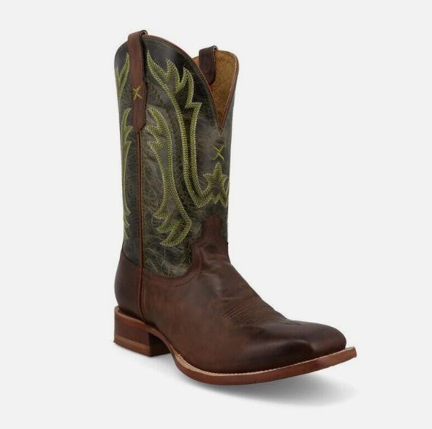 The Twisted X 12" Rancher Tobacco Brown & Seaweed Western Boot is built for dependable ranch wear with modern comfort engineered into every step. Featuring a leather vamp and a 12" leather shaft with pull tabs, this pull-on boot delivers classic Western styling with practical durability. Inside, a leather lining with taped seams enhances comfort, while a full-length composite insole and CellSole® footbed with CellStretch® technology provide cushioning in the forefoot and heel. Finished with a wide square toe, leather outsole, and a block heel with rubber cap and integrated spur shelf, this Rancher boot is designed for long days in the saddle or on the ground.