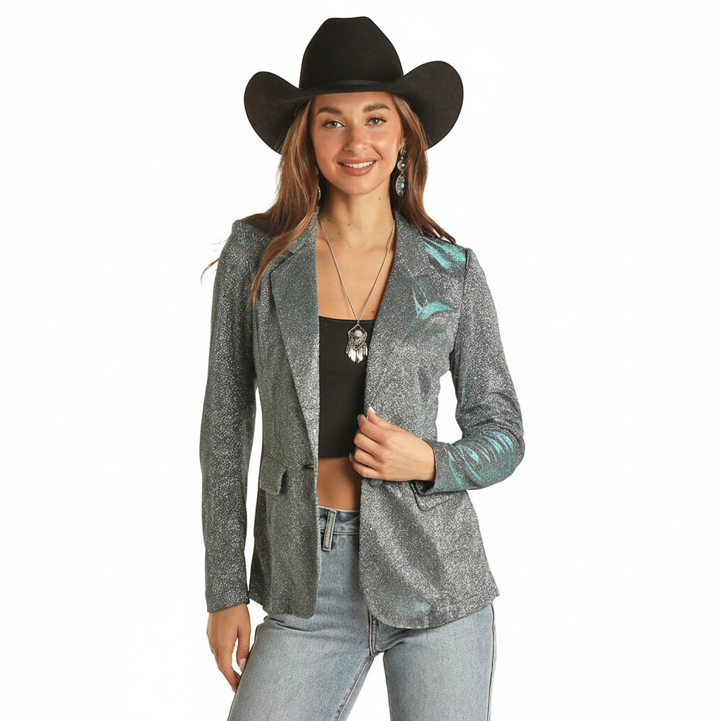 The Rock & Roll Iridescent Blazer delivers eye-catching style with a polished, fashion-forward edge. Finished in a striking teal color with an iridescent sheen, this blazer reflects light beautifully while maintaining a clean, structured silhouette. Designed with a flattering women’s fit, it’s the perfect statement piece for events, nights out, or elevated everyday looks.