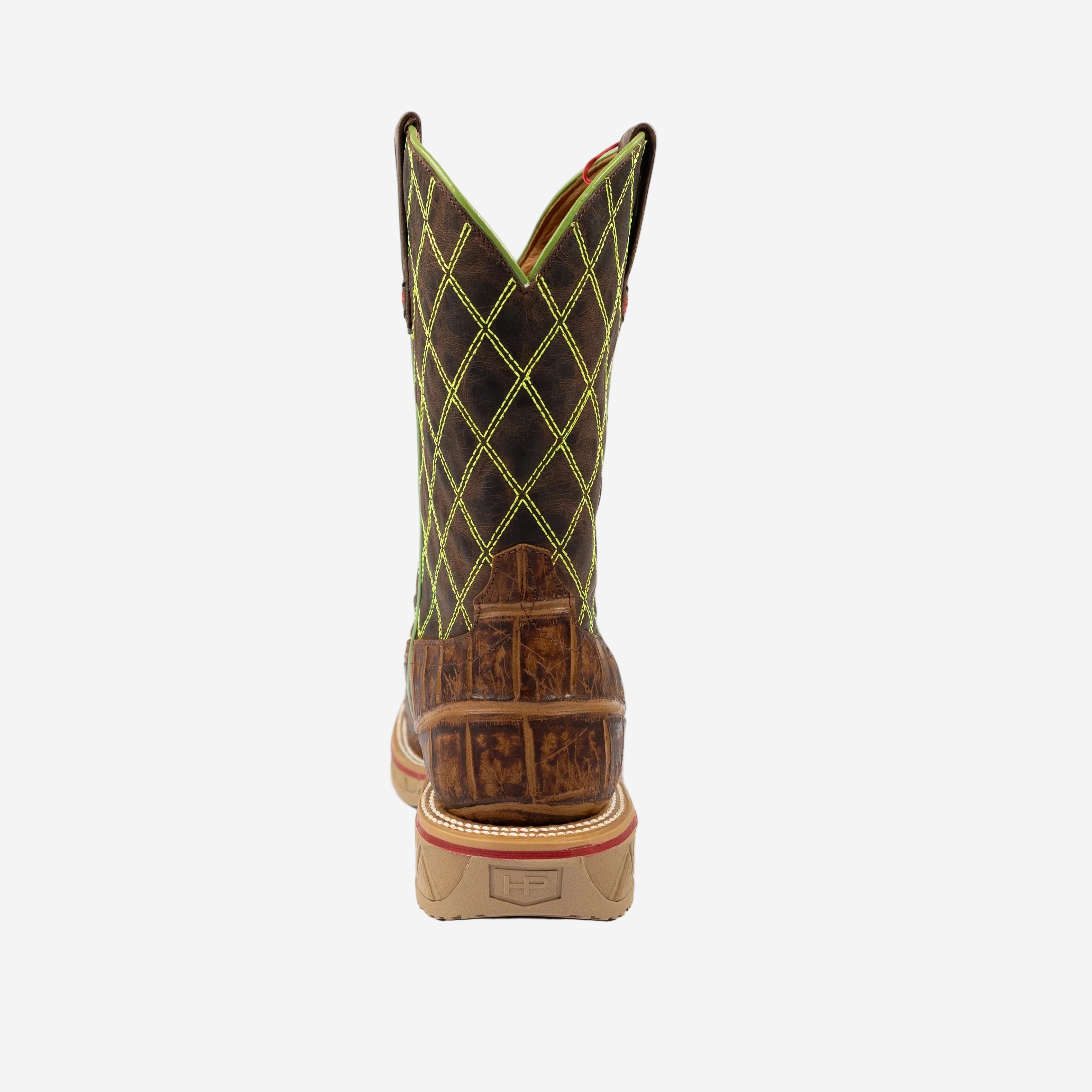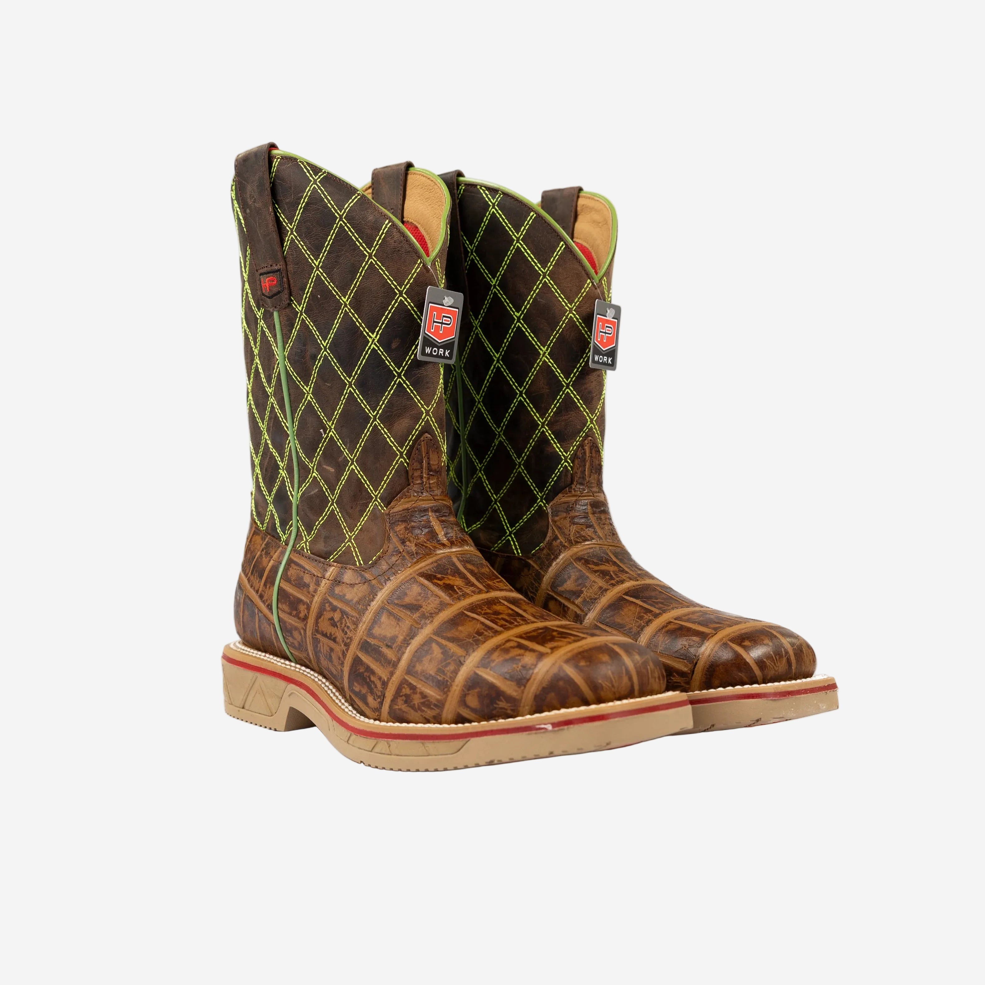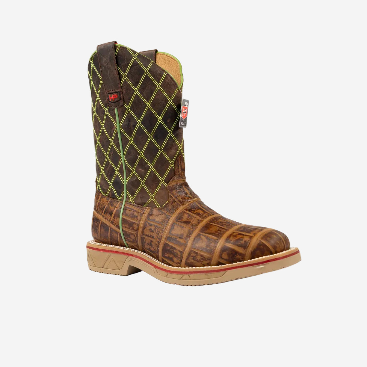 The Horse Power HPW2518 Steel Toe Work Boot delivers classic western style with dependable jobsite protection. Crafted with premium Saddle Gator Print leather and a tall 13" Bone Mad Dog shaft, this pull-on boot combines rugged durability with a square toe profile built for long days on your feet. A steel safety toe adds trusted protection, while the HP Work heel and HPW outsole provide stability and traction for demanding work environments.