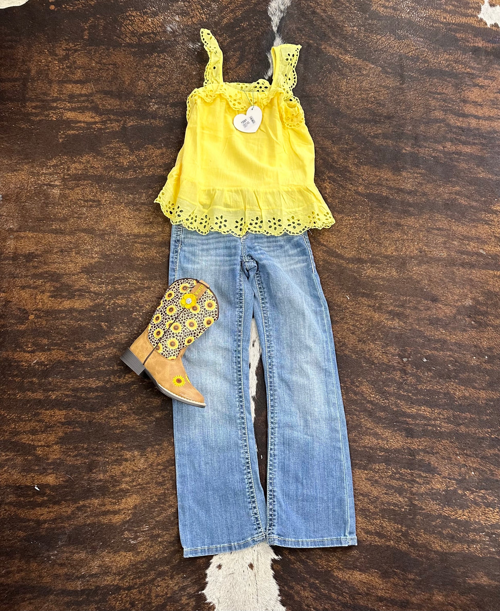 Add a burst of sunshine to your little one's wardrobe with our Sunny Yellow Eyelet Top. This delightful sleeveless top features playful ruffled straps and intricate eyelet embroidery, making it a charming choice for any occasion.