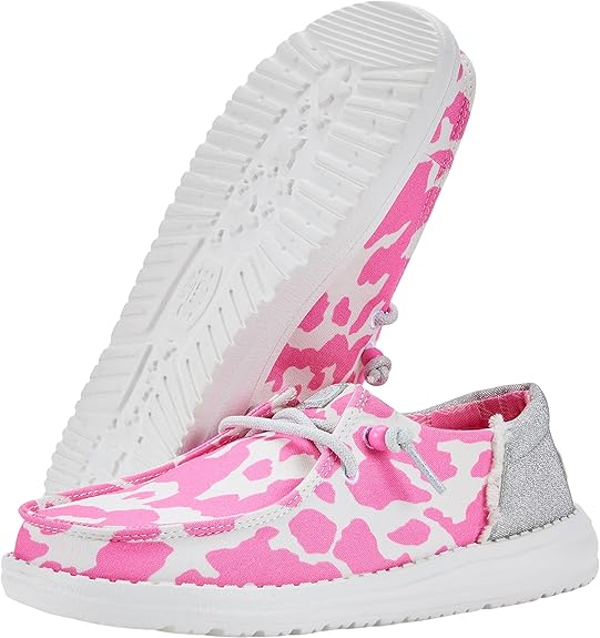Relax into your passion with the HEYDUDE Wendy Funk Cowgirl Bling women's slip-on sneaker. With a textile upper featuring a cool pink & white cow print for extra style, this sneaker is travel ready and low maintenance. The removable foam insole offers ergonomic cushioning while the ultralight outsole sets you free to explore unfettered.