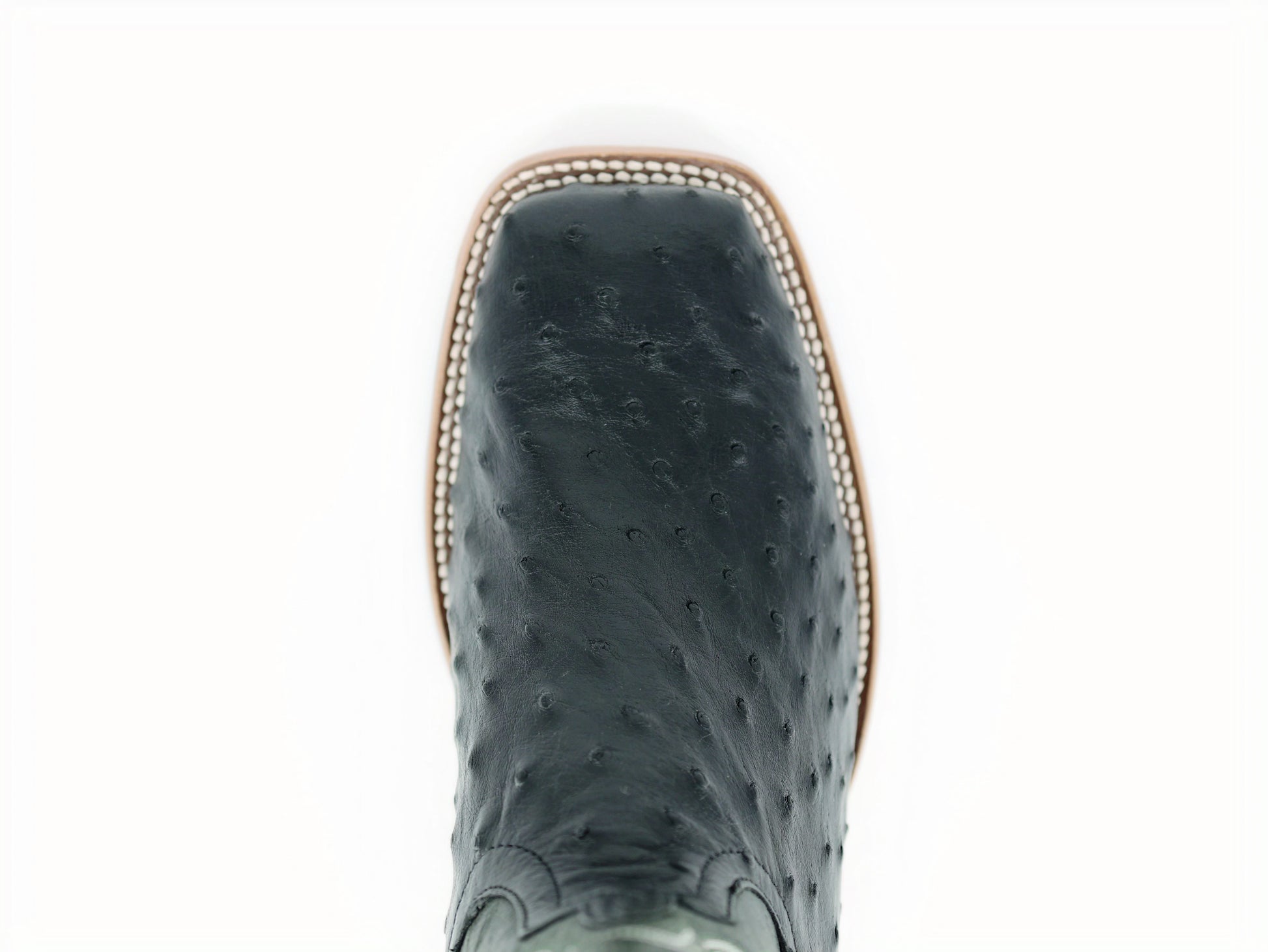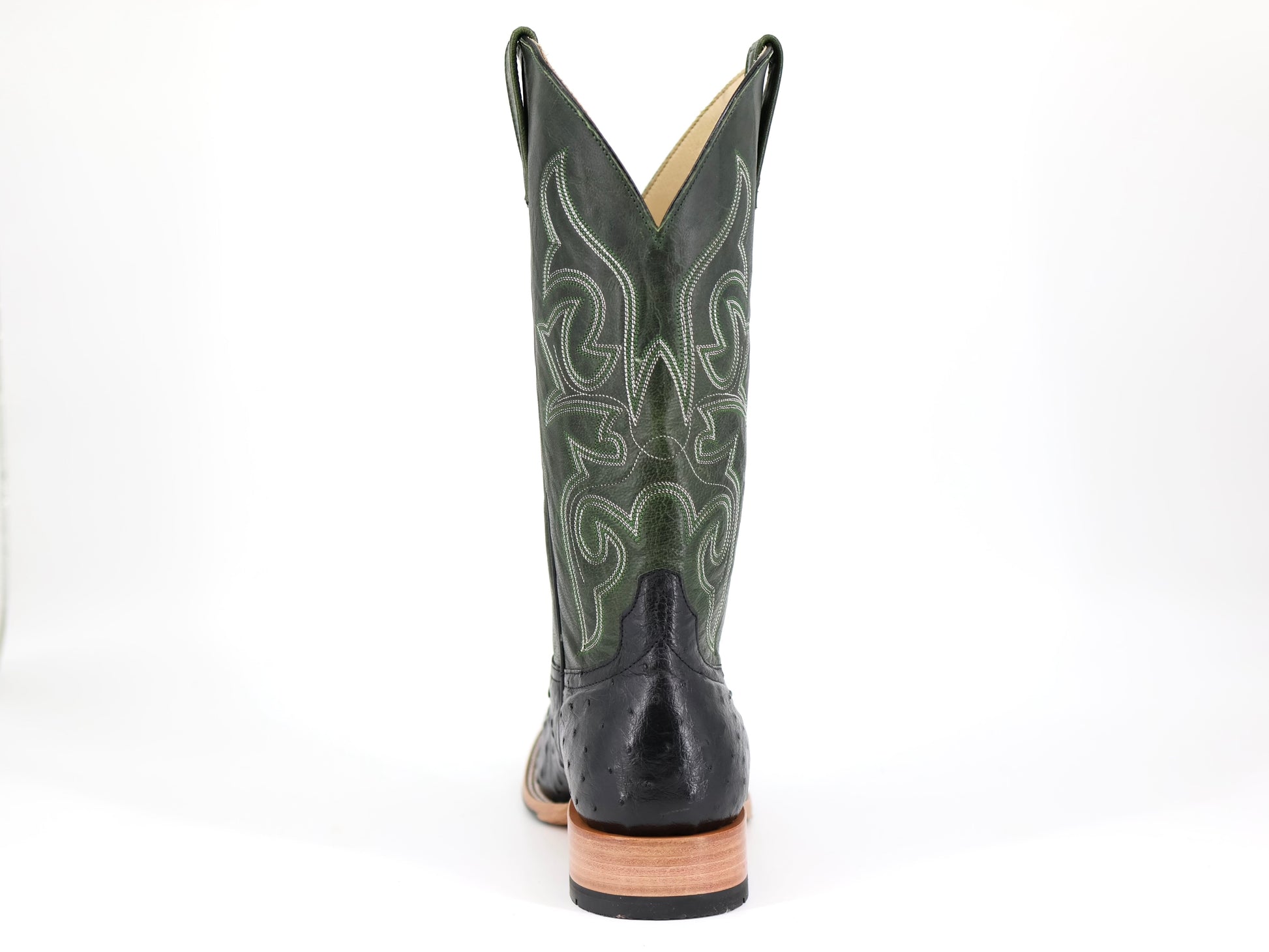 Step into elegance with these premium black full quill ostrich boots. The striking texture of full quill ostrich leather on the vamp offers unmatched sophistication, while the 13" shaft in vibrant emerald explosion leather adds a bold pop of color. Featuring a wide square (DB) toe and a classic roper-style stacked leather heel, these boots are as stylish as they are comfortable. The hybrid sole design ensures enhanced durability and versatility for any occasion.