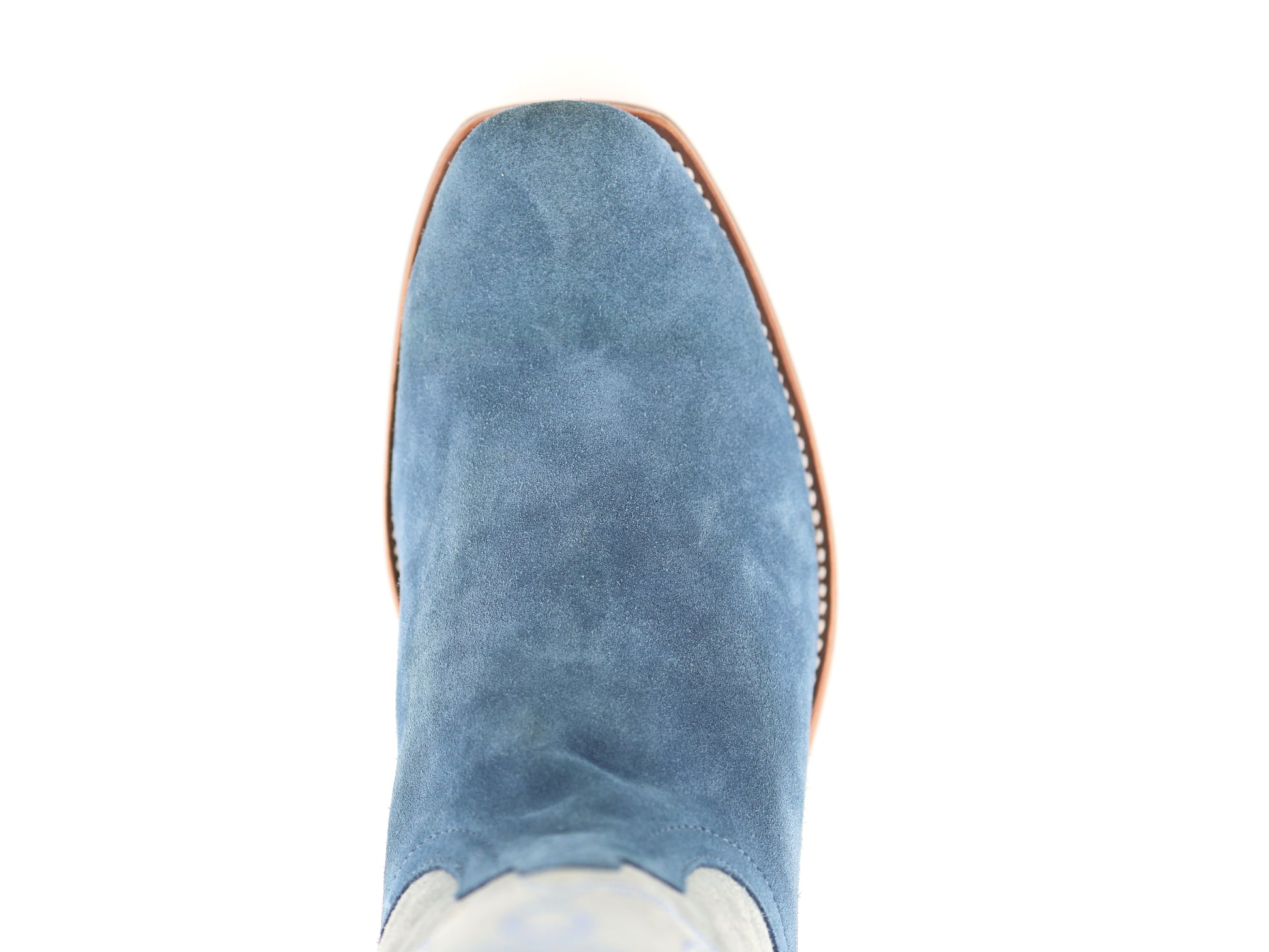 These boots feature a stylish combination of Blue Suede for the Vamp Leather and 11" Grey Sinsation for the Top Height, creating a unique and attractive look. The TK Toe and Cowboy Heel add a classic touch, while the Tan Hybrid Sole with Black Neoprene Midsole offers durability and comfort. Overall, these boots are a blend of modern style and traditional craftsmanship, perfect for anyone looking for a standout pair of cowboy boots.