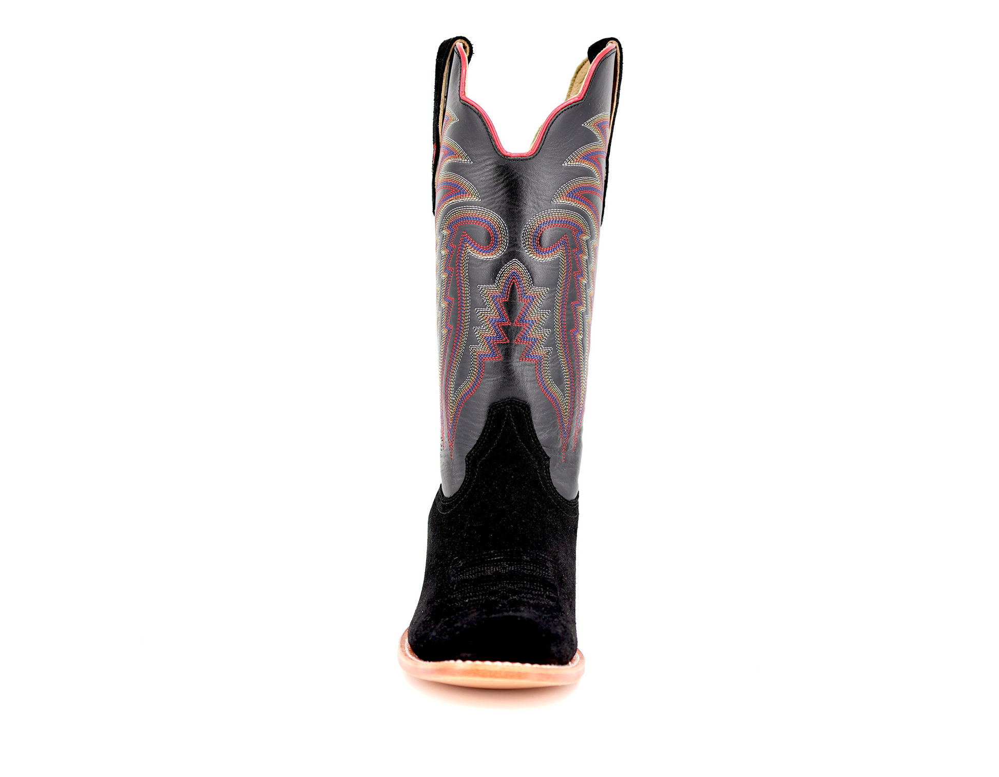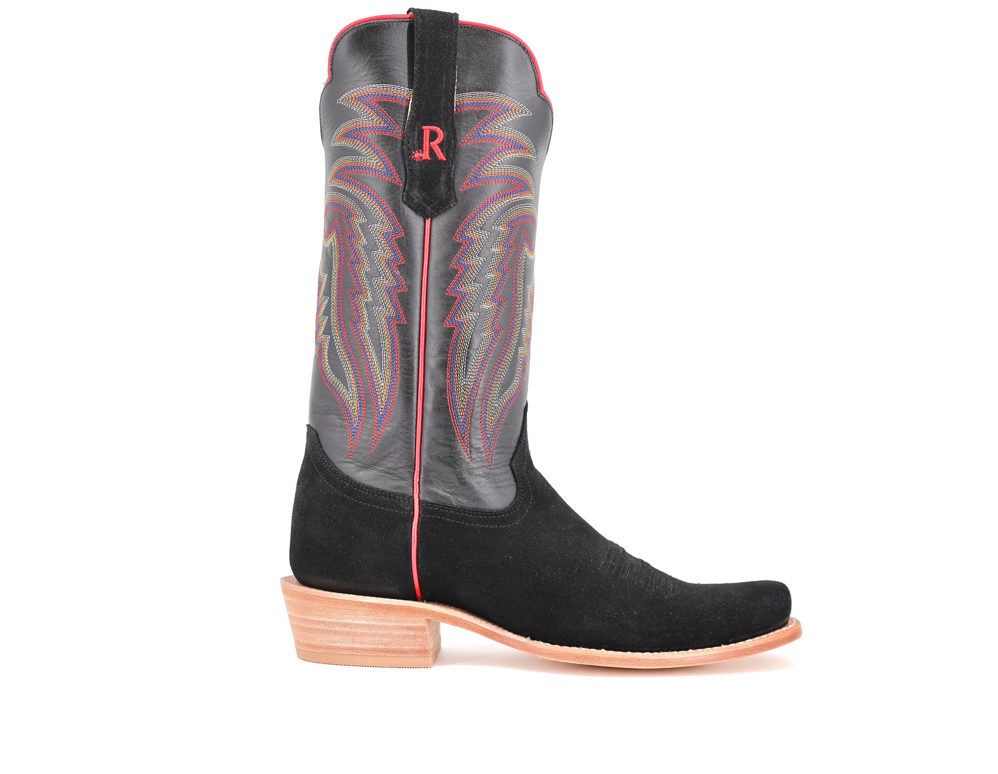 Crafted for durability and classic western style, these R Watson men’s boots feature a 13" shaft with a black rough out cowhide foot and a matching smooth black cowhide upper. Designed with a wide square toe and a cushioned leather insole, they offer all-day comfort and rugged performance. The boots are finished with a leather outsole, double-stitched welt, and a traditional leather block heel. Full cowhide leather lining and pull straps complete this timeless pull-on design.