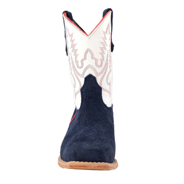 Step into adventure with the R. Watson Kid’s Navy Rough Out/Winter White boots! Featuring a fun 10-row stitch pattern and a comfy R. Watson comfort system, these boots keep little feet happy all day. The navy roughout vamp pairs perfectly with winter white cowhide tops, while the wide square toe and all-leather outsole ensure sturdy, confident steps. Finished with a stacked leather heel and durable counters, these boots are ready for endless play and heartwarming style.