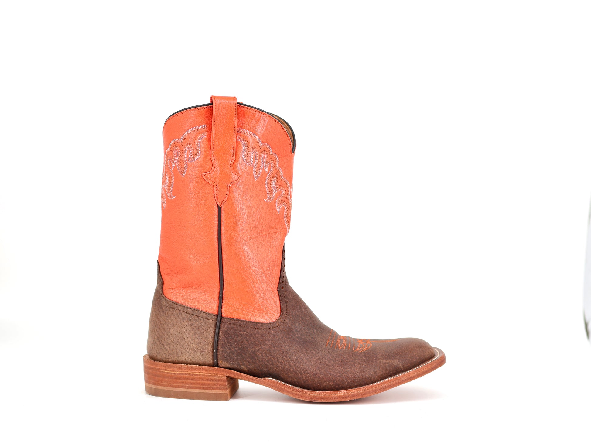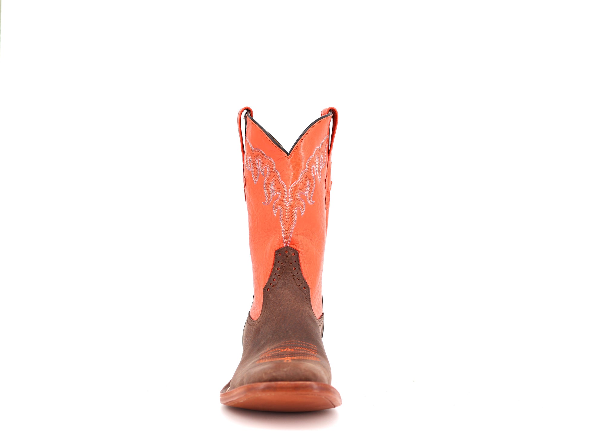 Expertly handcrafted, these Rios of Mercedes boots combine rugged durability with bold, eye-catching style. The foot is made from glazed tobacco pigskin leather, giving it a rich, textured look with a polished finish. The shaft, in striking tanager kidskin leather, adds a vibrant pop of color and showcases intricate western stitching for a true cowboy flair. Designed with a broad square toe and leather sole, these boots offer lasting comfort and support, whether you're working on the ranch or out on the town.